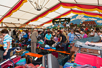 Ab 14 Uhr konnten sich die Flohmarkt-Besucher für jeweils 5 Euro eine große Tüte erwerben und diese an den Ständen nach Belieben füllen. Diese Aktion fand großen Zuspruch und führte zu einem regelrechten Abräumen der verbliebenen Waren. Als das große Aufräumen startete, hatten die Flohmarkt-Helfer fast nur noch (wieder verwertbare) Textilien einzupacken und in weniger als einer Stunde waren beide Zelte besenrein.