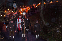 Am vergangenen Samstagabend, den 07.12.2012, wurde in stimmungsvolle Atmosphäre die Barbara-Kapelle durch Pater Stephan Raster geweiht. Bei dem Festakt kamen rund 300 Gäste, um bei Einbruch der Dunkelheit mit Fackeln von Mühlham hinunter zur Vils zu ziehen. Dort strahlte die Kapelle und erleuchtete den Wald. Die Idee hatten die Böllerschützen in Vilshofen. Sie wollten eine Bauruine vor dem Verfall retten. Sie bauten auf eigene Kosten ein altes Steinbruch-Trafohäuschen an der Vils bei Mühlham in die kleine Barbara-Kapelle um. Fotos: Peter Georg Laudi